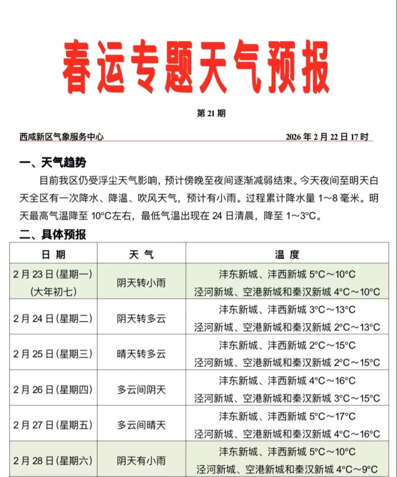 22日夜间至今天白天西咸新区普降小雨,降水将于傍晚20时前后自西向东逐渐结束。今天最高气温降至10℃左右。降水、降温天气易引发道路湿滑结冰,请注意防范。