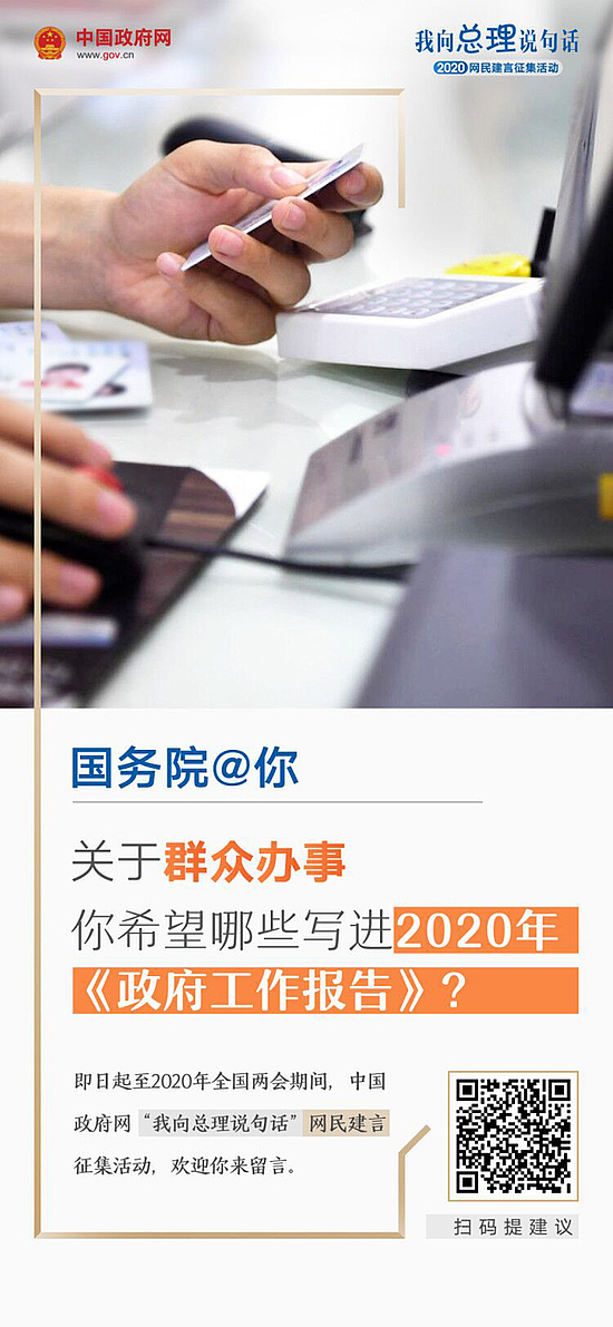 国务院@你,关于营商环境、群众办事、就业创业、教育、医疗、养老……你希望哪些写进2020年《政府工作报告》?快扫描海报二维码,参与中国政府网2020“我向总理说句话”网民建言征集活动!你的声音,总理能听到!