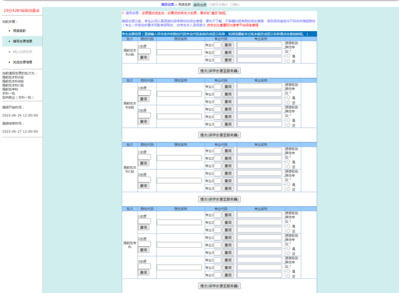 提前批次(含文史类、理工类专科、艺术类专科和体育类专科)、单设本科批次、本科一批、职教单招(本、专科)志愿在6月24日12:00至6月27日12:00填报;