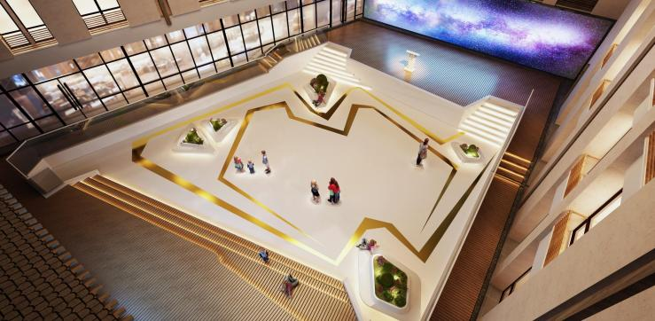 客栈由四栋现代中式风格的建筑围合,每栋5层,客房98间,是以亲子空间、电竞体验为主题的智能型酒店。