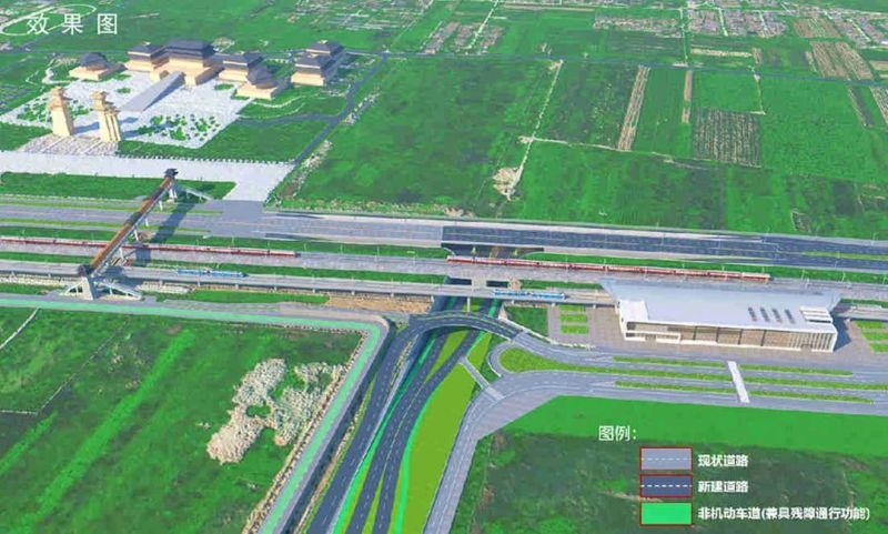 陕历博秦汉馆东南角,秦汉馆周边交通配套工程,分为秦宫一路立交和兰池三路(秦宫一路-机场中线段)两部分。其中,秦宫一路立交由秦宫一路向北延伸,下穿地铁14号线和西铜铁路,通过匝道与兰池三路相连,兰池三路(秦宫一路-机场中线段)向东连接兰池三路跨咸铜铁路立交工程。项目建成后,将全面解决泾渭大道、兰池大道、兰池二路、兰池三路和地铁14号线秦宫站的互联互通,串联起陕历博秦汉馆、秦咸阳城国家考古遗址公园、秦文明广场、大汉紫道、秦咸阳城宫殿遗址保护展示区等项目,满足周边群众和游客出行需求。