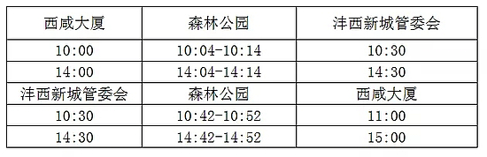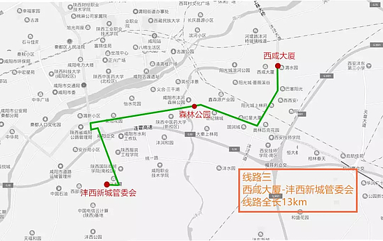 该线路由西咸大厦出发,途经沣泾大道、世纪大道、白马河路至沣西新城管委会,全程约14km,设置西咸大厦、森林公园、沣西新城管委会等3处停靠站点,配备10米级纯电动清洁能源客车1台。